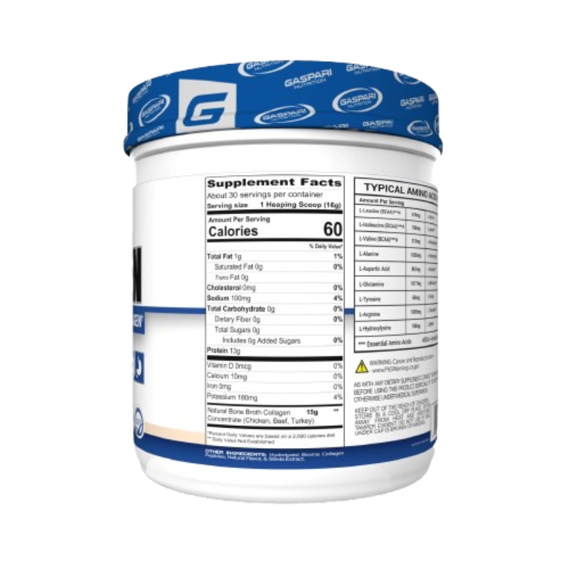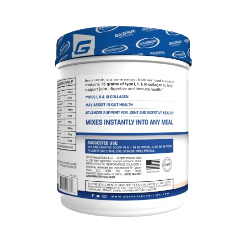 - Gaspari Bone Broth Collagen es un suplemento de proteína de colágeno hidrolizado de primera calidad diseñado para apoyar la salud de las articulaciones, la recuperación muscular y la resistencia atlética.